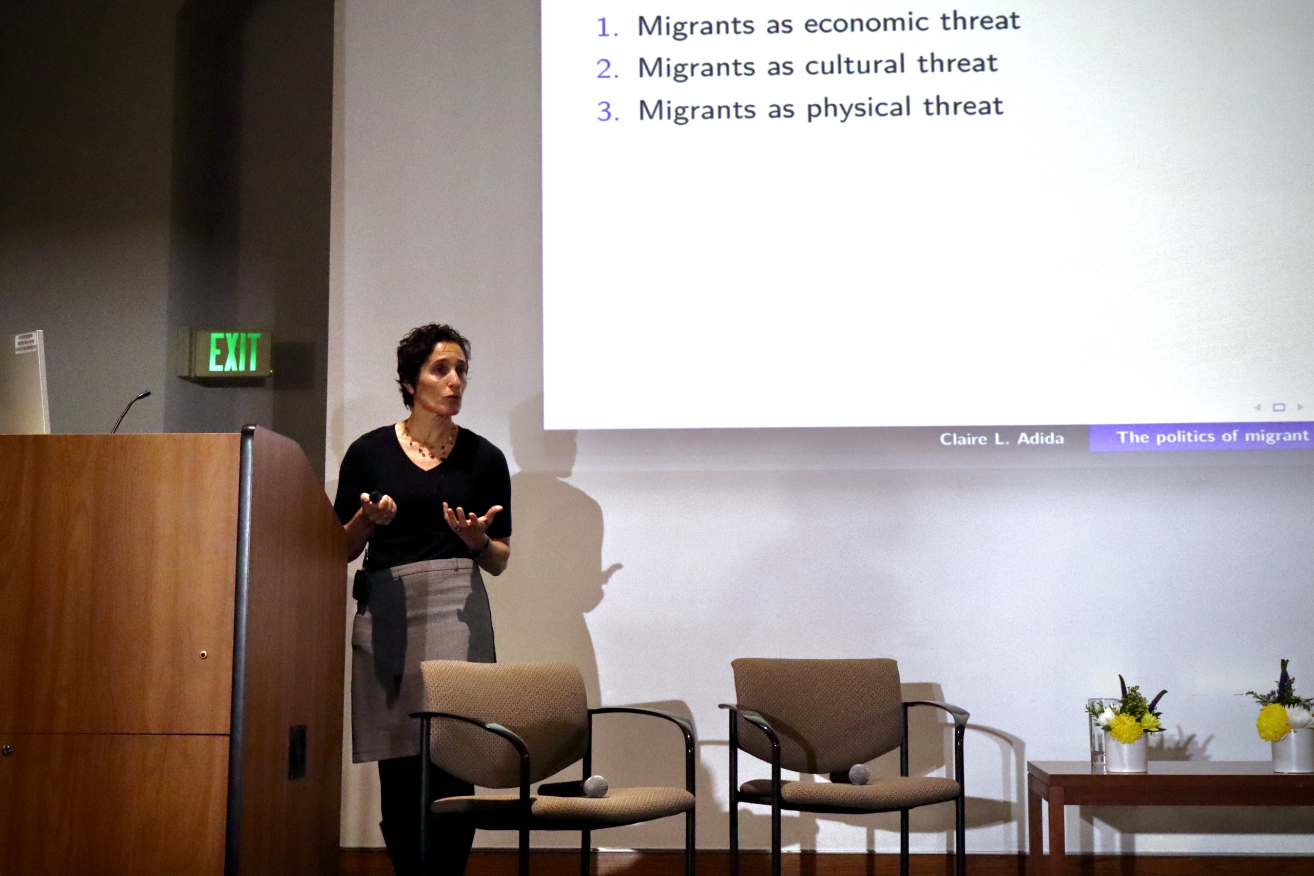 Adida describes the drivers of migrant exclusion. Photo by Hannah Park.