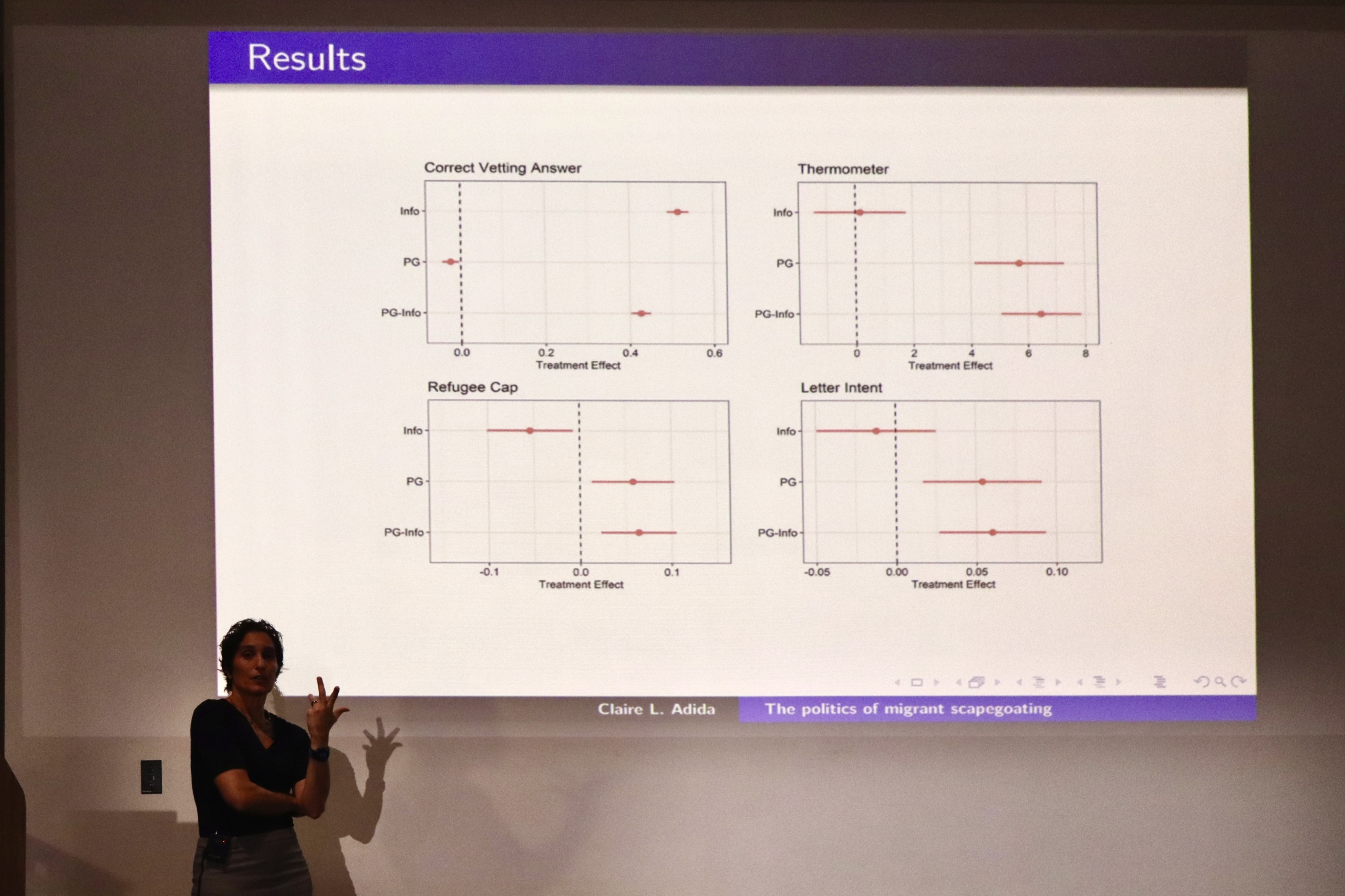 However, Adida wanted to “turn the tables” and foster inclusion instead. She conducted research to explore what types of messages would be most effective in doing so, sharing key takeaways from her paper: “When hearts meet minds: complementary effects of perspective-getting and information on refugee inclusion” (2025). Adida credited fellow researchers Adeline Lo, Melina Platas, Lauren Plather, and Scott Williamson.