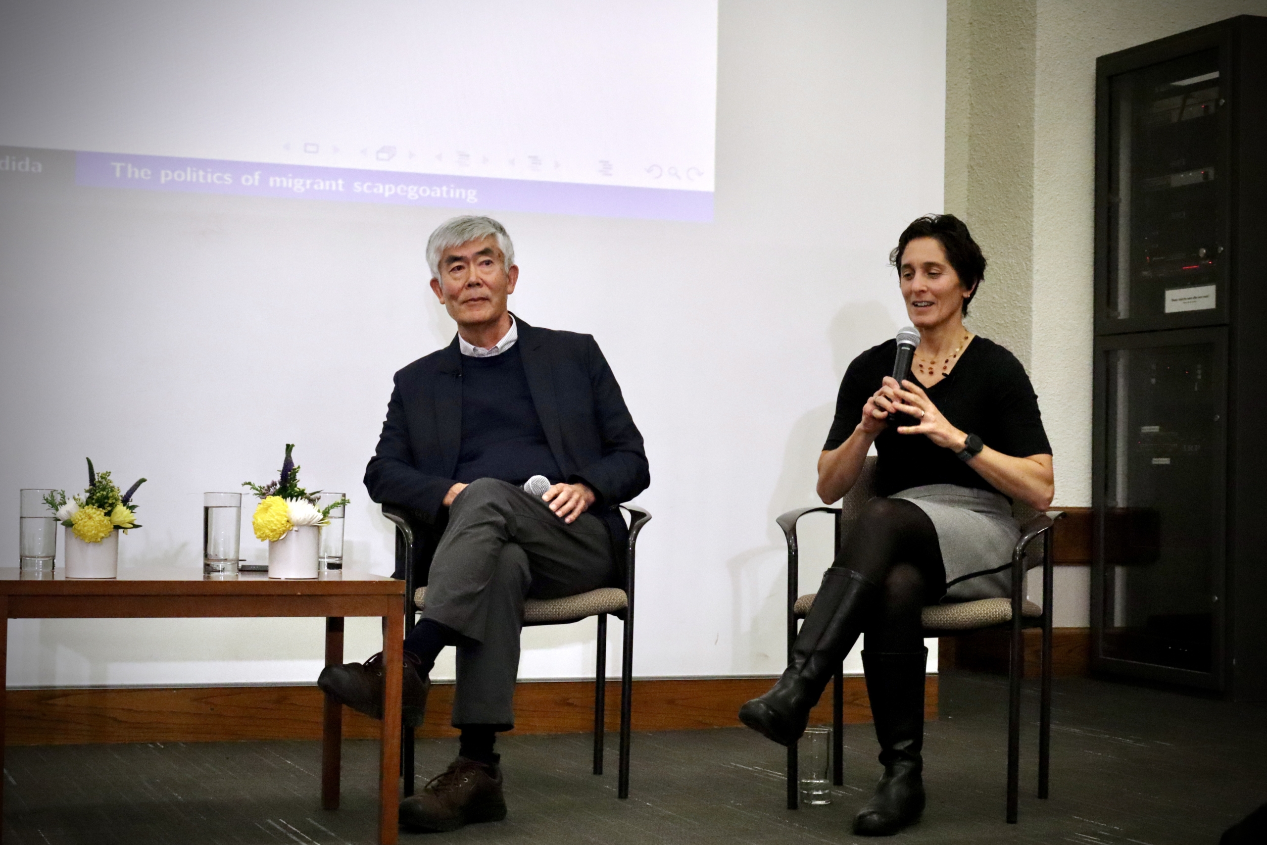Claire Adida answers a question alongside her fellow panelist, Hiroshi Motomura. Photo by Hannah Park.