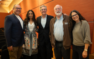 Imam Dr. Jihad Turk, Valarie Kaur, Prof. David Myers, Fr. Greg Boyle, and Rabbi Sharon Brous gather for a photo after the event.