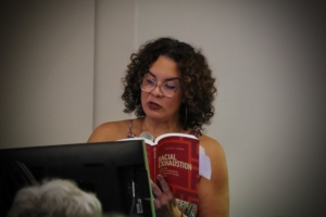 Dr. Ralina L. Joseph reads an excerpt from her latest book, Racial Exhaustion: How to Move through Racism in the Wake of DEI. Photo by Hannah Park.