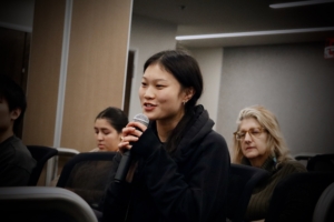 Regina Lee, a fourth-year UCLA student, asks a question. Photo by Hannah Park.